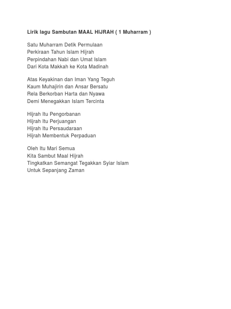 Perkiraan Tahun Islam Hijrah. Berikut dibawah ialah lagu maal hijrah yang masih segar diingatan. Maal Hijrah Satu Muharam Detik Permulaan Perkiraan Tahun Islam Hijrah Perpindahan Nabi dan Umat Islam Dari Kota Makkah ke Kota Madinah.